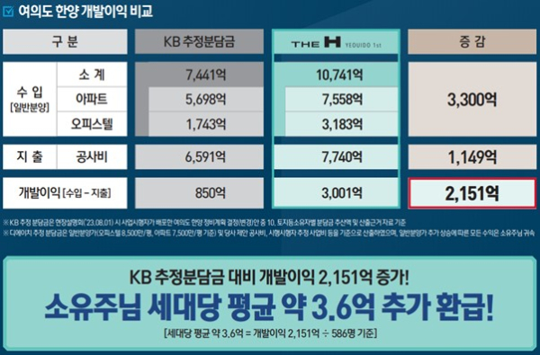 현대건설 KB추정분담금 대비 분양수입을 3300억원 이상 증가시켜 공사비 지출 증가를 감안하더라도 2151억원 이상의 개발이익을 창출할 수 있을 것으로 추산하고 있다. 이에 따라 여의도 한양아파트 소유주는 세대당 약 3억6000만원의 추가 환급을 받을 수 있게 하고, 동일평형 입주 시에는 모든 소유주가 환급을 받을 수 있도록 할 예정이다. 여기에 일반분양가가 오르면 이에 대한 이익은 소유주에게 귀속하는 등 소유주의 프리미엄 극대화 방안도 제시했다.